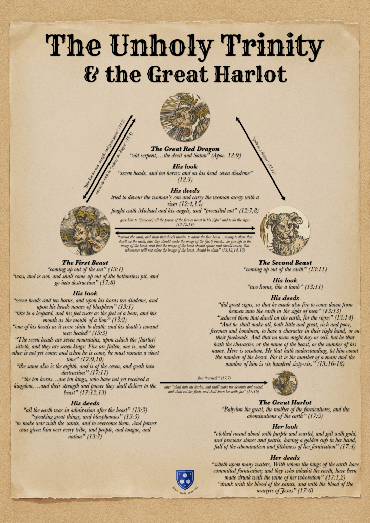 A key to understanding the identities of the two beasts is to read their biblical descriptions carefully and understand the relations among Satan (the great red dragon) and the beasts. These are summarised in our poster The Unholy Trinity & the Great Harlot shown on this page. Satan and the two beasts form what is sometimes known as the Unholy Trinity. Contrary to God the Holy Trinity Who vouchsafes us salvation, the Unholy Trinity instigates us to rebel against God, and tricks us into eternal damnation in hell. Together with the great harlot, they constitute a mockery of the Trinitarian God and His Holy Mother Church. Unlike the Three Persons in the Holy Trinity being one in Nature, Substance and Essence, and “without difference or separation” (Preface of the Most Holy Trinity), the three persons in the Unholy Trinity are three separate entities, each coming before and giving rise to the next. The latter two persons, namely the two beasts, ultimately seduce people into adoring Satan, the dragon and the first person in this trinity.