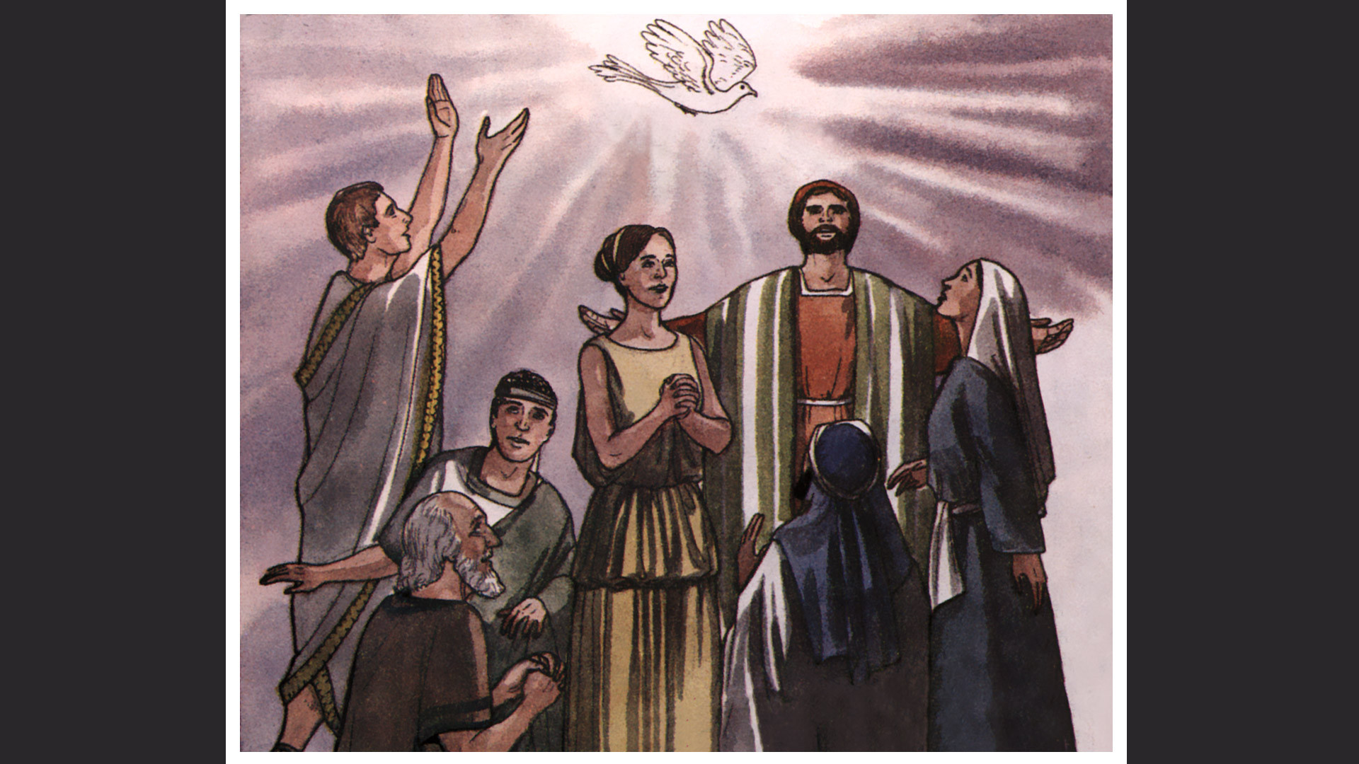 And when the days of the Pentecost were accomplished, they were all together in one place: 2 And suddenly there came a sound from heaven, as of a mighty wind coming, and it filled the whole house where they were sitting. 3 And there appeared to them parted tongues, as it were of fire, and it sat upon every one of them: 4 And they were all filled with the Holy Ghost, and they began to speak with divers tongues, according as the Holy Ghost gave them to speak. 5 Now there were dwelling at Jerusalem, Jews, devout men, out of every nation under heaven.